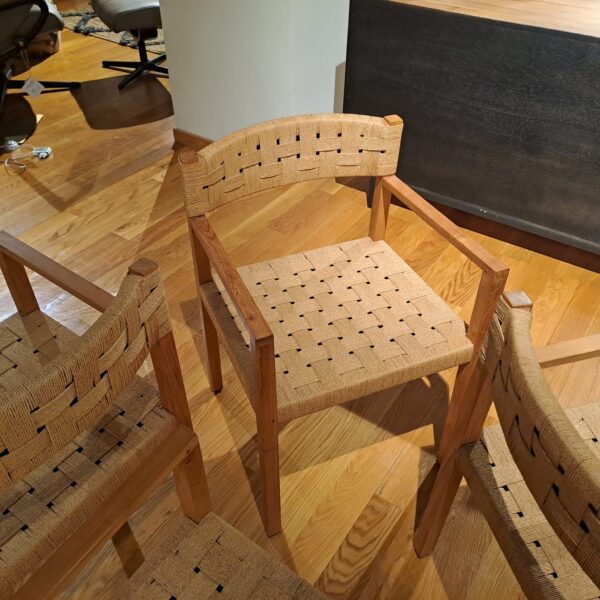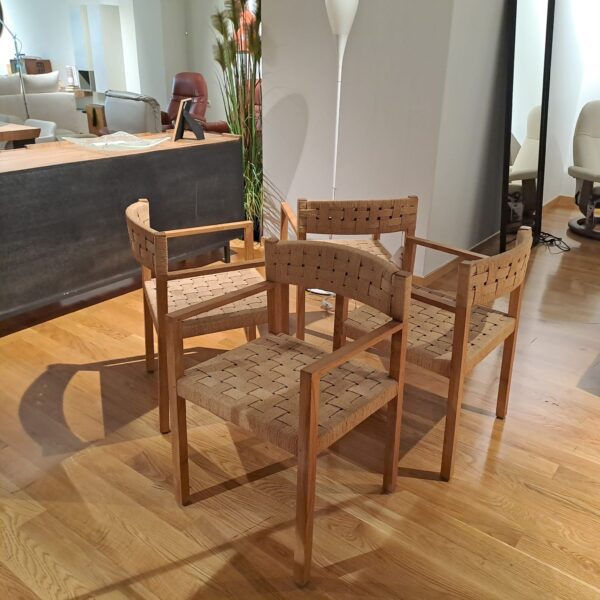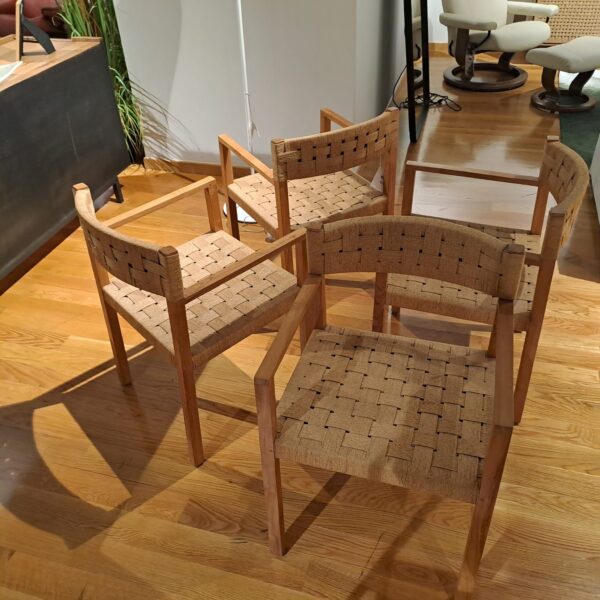 4 Sillas con brazos, estructura en teca reciclada y asiento y respaldo en fibra.