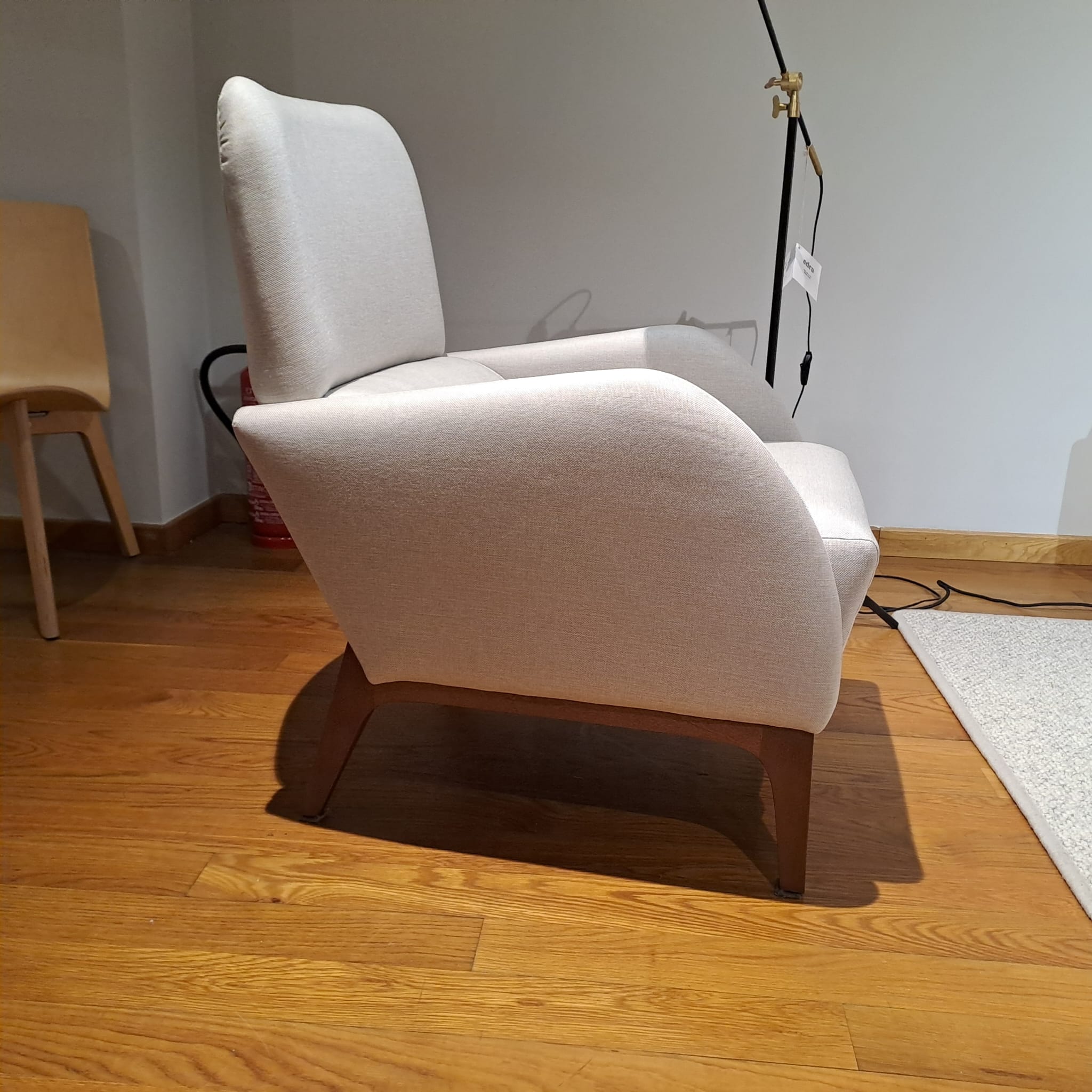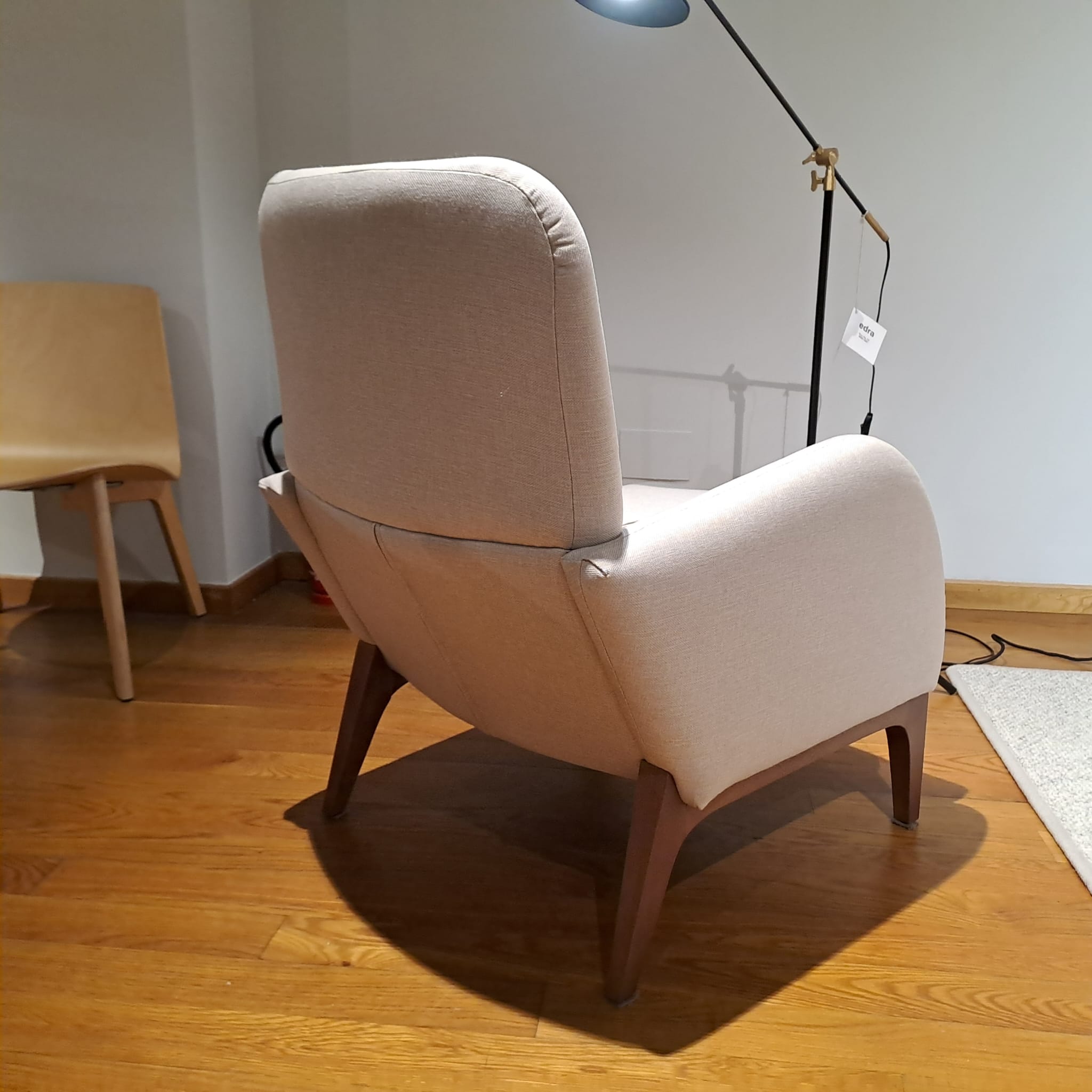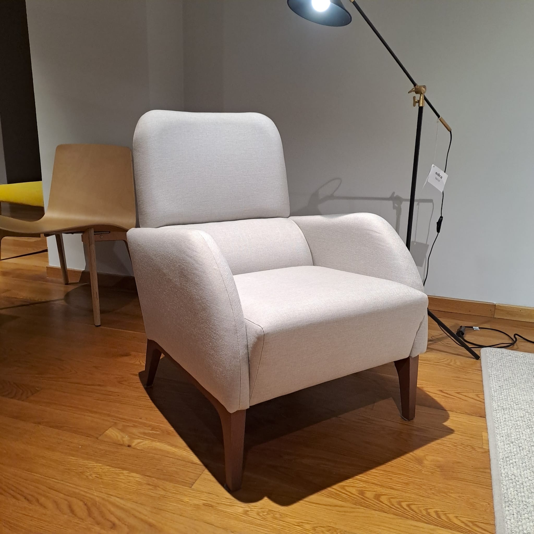 Butaca tapizada en tejido Libra 05 de fácil limpieza, con patas de madera y diseño elegante. Ideal para salón o dormitorio.